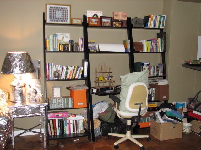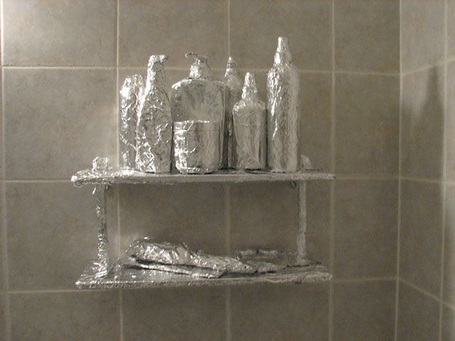 Having gotten home really late since the trains only run every half hour in the wee hours of the morning, I lingered around at home dreading having to go back in the city. I told a few people of my late night escapade and they were clamoring for pictures, which I still don't have. Around 5:00 pm, I was still sitting at home in Hoboken and I told the peanut gallery that with every passing minute, I'm losing my motivation to go back in the city. It turned into an online pep rally or something. Next thing I know, I'm eating dinner and packing for another extended night of foiling at Liz's apartment. They wanted me to foil the desk and her bathroom too. "But you've come so far," they said. "Don't stop now. Keep going!" Again, with the limitations of a one man wrecking crew, I could only get so much done on my own. I picked the bathroom. They demanded updates and a live webcast of my activities. I said if I could find her webcam, I will see what I can do.