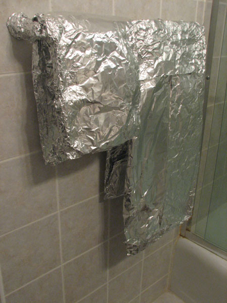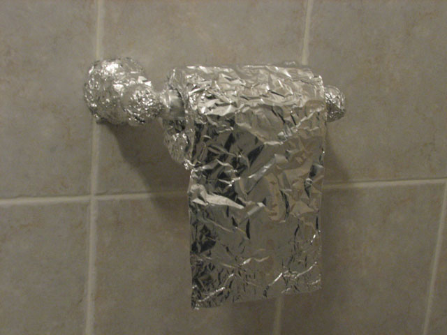 Next, it was on to the shower. I removed the showerhead from the hook to let it hang so I could have two free hands to foil the shower cable. It wasn't even halfway down when jets of water nailed me directly in the head and torso. I jumped back a bit freaked because I thought I accidentally turned the shower on, but the water stopped almost as immediately as it started. I realized it's because the showerhead is now below the faucet point so it was the leftover water in the system coming out. Dammit! Oh, wouldn't you know? The towels are already foiled. I didn't pack a change of clothes either because I didn't really plan on sleeping. Now not only do I have to spend many hours in someone's bathroom, but spend it drenched! I hate myself.