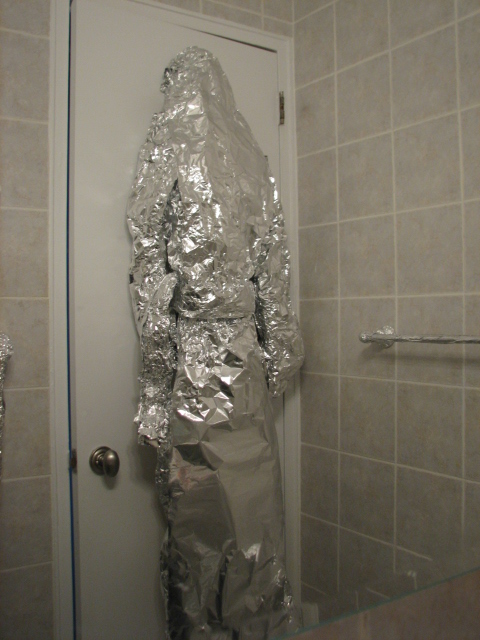 I quickly learned how difficult tin foiling was. Long flat surfaces are deceptively hard. You think because the surface is smooth, you can just cover it, but foil doesn't adhere to vertical walls. Every item was like its own annoying puzzle. All you have is a roll of foil to work with, a set width and somewhat unlimited length. I know what you're thinking--just tape it on, no big deal. THAT'S CHEATING! I have principles dammit. Besides, it would be wrong to leave sticky tape residue all over someone else's stuff.
