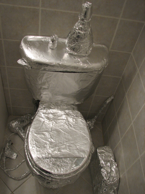I realize there must be something wrong with me having spent six hours foiling the previous night to go back for more. Not only is it really tedious, but I'll now be stuck in the confines of a bathroom for hours on end. On top of it all, I had already foiled the couch so if I were to even sleep at all, I'd have to sleep on the floor. Yet, they were right. I have come so far. A good scheme requires sacrifices to be made for the bonus laughs. It'll be a long night of going nowhere that's ideal for the makings of a Snickers commercial. I'm packing my brother's good headphones.