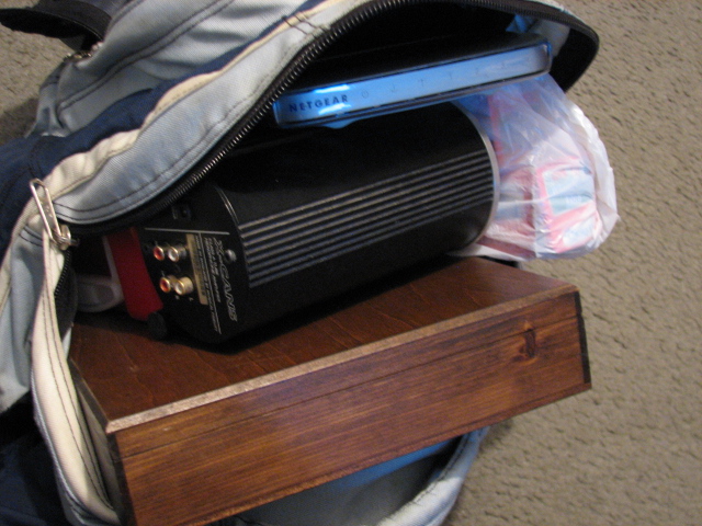 I thought about all the random stuff in my bag--giant headphones in a wooden box, headphone amplifier, a lunchbox full of overnight essential, rolls of tin foil, camera, and a wireless router. You wouldn't go through the hassle of bringing headphones in a giant wooden box and using amplifiers with them unless you planned on listening to music for a long time. The funny thing is, there really is no better explaination so I told him the truth. I was packing to be comfortable for a really long night of tin foiling my friend's apartment. He laughed and thought it was hilarious. I was free to go. Of course, he couldn't fit everything back in my bag to zip it so I had to take everything back out again and re-pack the bag for the third time.